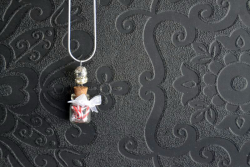 Des petits sucres d'orge dans une fiole. Faites votre choix : sautoir, collier, boucles d'oreille.